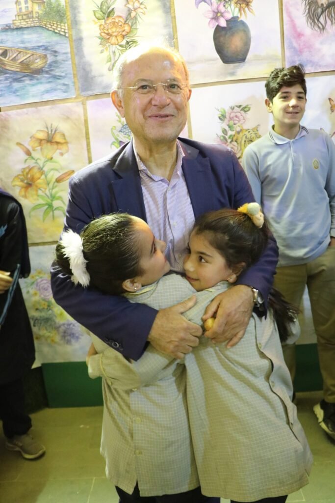 استمع فضل الله الى شرح العديد من الطلاب عن لوحاتهم ومفهومها بألوانها وكلّ عناصرها التي تجمع بين اللون واجمال الحرف.