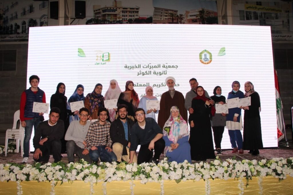 كرمت ثانوية الكوثر ثلة من المعلمين والاداريين الذين أمضوا من 5 إلى 30 عاماً من العطاء في ربوع جمعية المبرات الخيرية، وذلك في حفلٍ تكريميٍ نظّمته في قاعة الكوثر الرياضية الدولية بمناسبة عيد المعلم، مع مراعاة الإجراءات الوقائية.