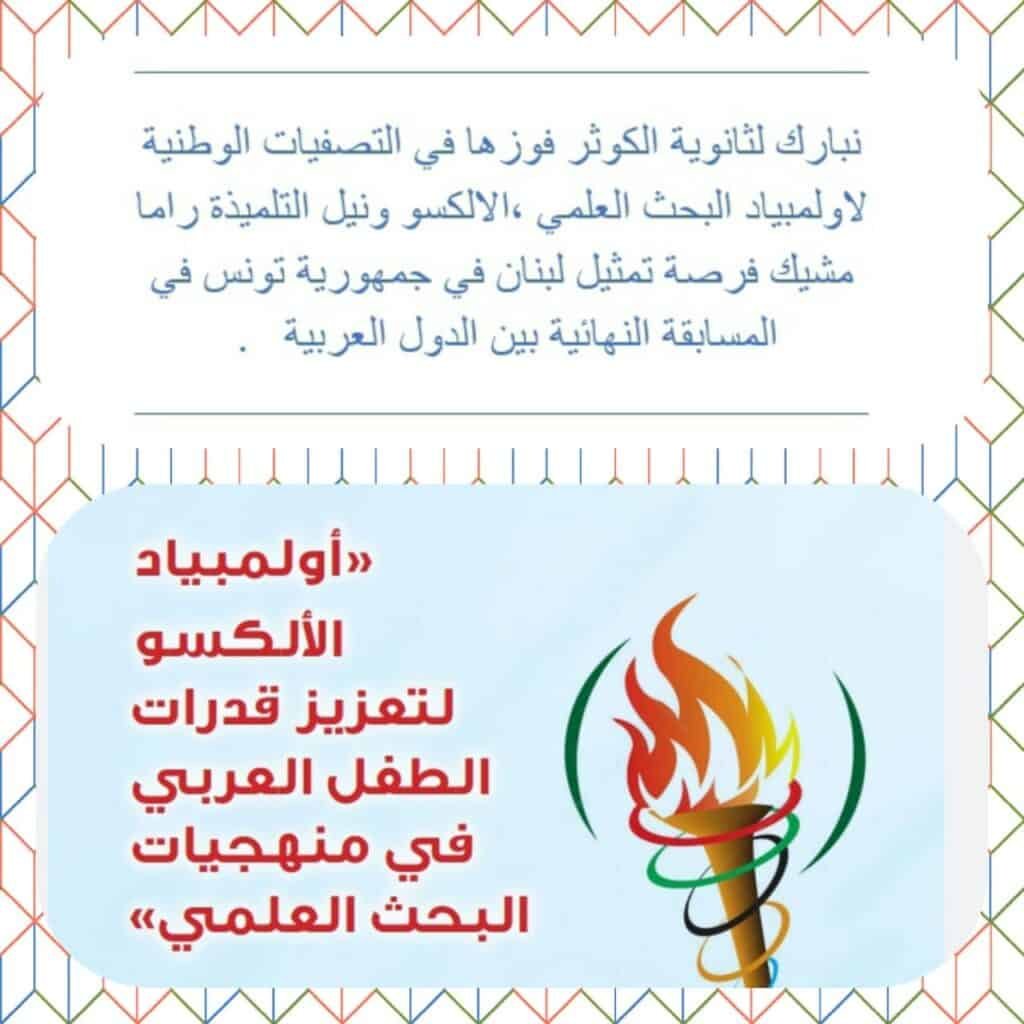كما شاركت الثانوية في مسابقة تعزيز منهجيات البحث العلمي لدى الطفل العربي التي نظمها المركز التربوي للبحوث والانماء بالتعاون والتنسيق المشترك مع اللجنة الوطنية لليونيسكو. وقد فازت التلميذة راما مشيك بفرصة تمثيل لبنان في أولمبياد البحث العلمي الذي تنظمه الألكسو في شهر أيلول 2022 في جمهورية  تونس .