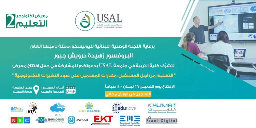 برعاية ” اللجنة الوطنية اللبنانية لليونيسكو” ممثلة بأمينها العام البروفيسور زهيدة درويش جبور، تتشرّف كلية التربية في جامعة العلوم والآداب اللبنانية بدعوتكم للمشاركة في حفل افتتاح معرض ” تكنولوجيا التعليم 2 “، وورشه التدريبية التي تمتد على 3 أيام في 26 -27 – 28 من شهر نيسان 2018 ، والذي سيُقام في حرم الجامعة في بيروت.