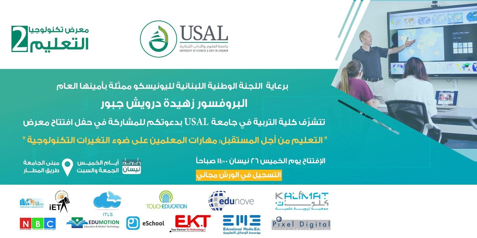 برعاية " اللجنة الوطنية اللبنانية لليونيسكو" ممثلة بأمينها العام البروفيسور زهيدة درويش جبور، تتشرّف كلية التربية في جامعة العلوم والآداب اللبنانية بدعوتكم للمشاركة في حفل افتتاح معرض " تكنولوجيا التعليم 2 "، وورشه التدريبية التي تمتد على 3 أيام في 26 -27 - 28 من شهر نيسان 2018 ، والذي سيُقام في حرم الجامعة…